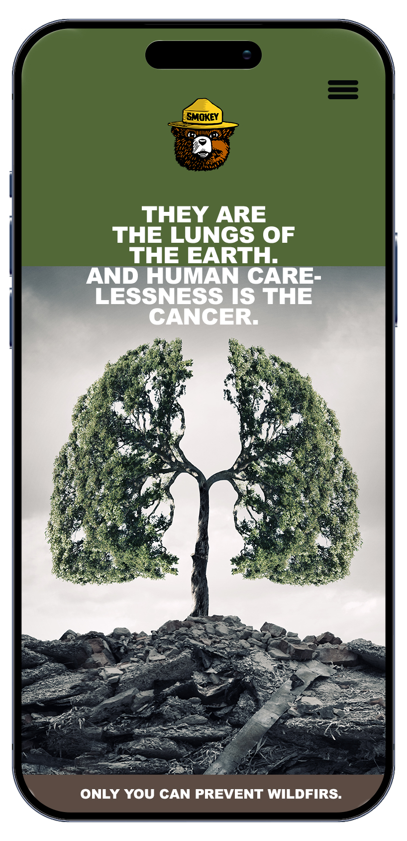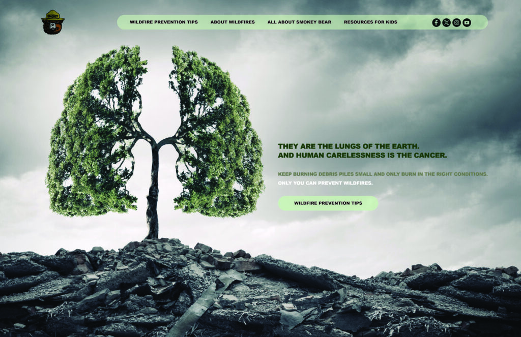 Wildfire prevention messaging often competes with distraction and familiarity. The challenge was to communicate the seriousness of human carelessness without relying on shock or spectacle—while maintaining the authority and trust of the Smokey Bear message. The work needed to stop people long enough to reflect, educate them clearly, and reinforce personal responsibility for preventing wildfires.